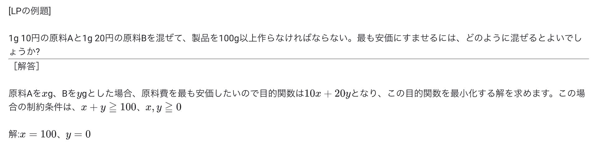 配合問題:変数は原料使用量、目的関数は原料コスト(最小化)、制約条件は成分の上限/下限