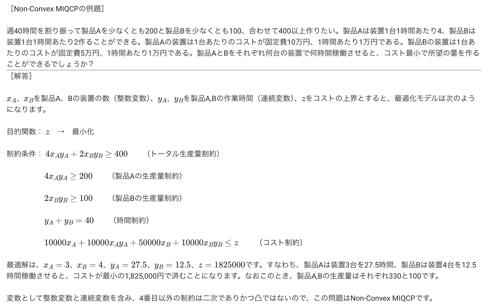 二次計画問題の変数の中に整数変数が混じっている時、その二次計画問題はMIQP(Mixed Integer Quadratic Programming / 混合整数二次計画問題)と言います。