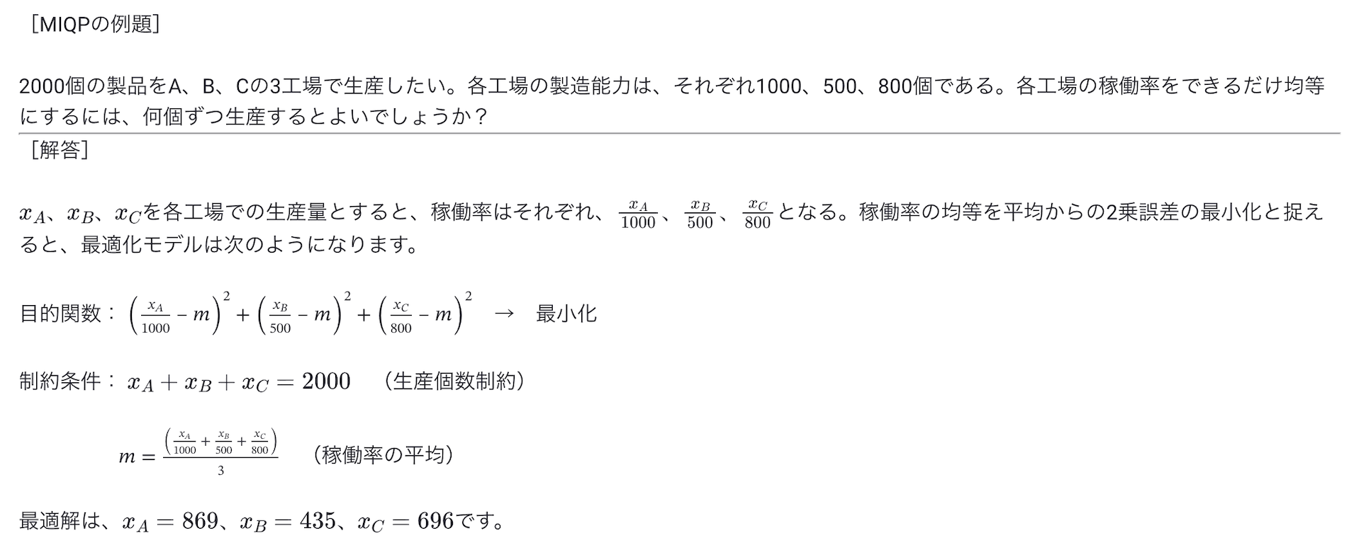 MILPに二次制約が付加された問題が、MIQCPの典型例です。要員のばらつきを指定値以下に抑えるという制約も加わったスケジューリング問題は、そのような例です。