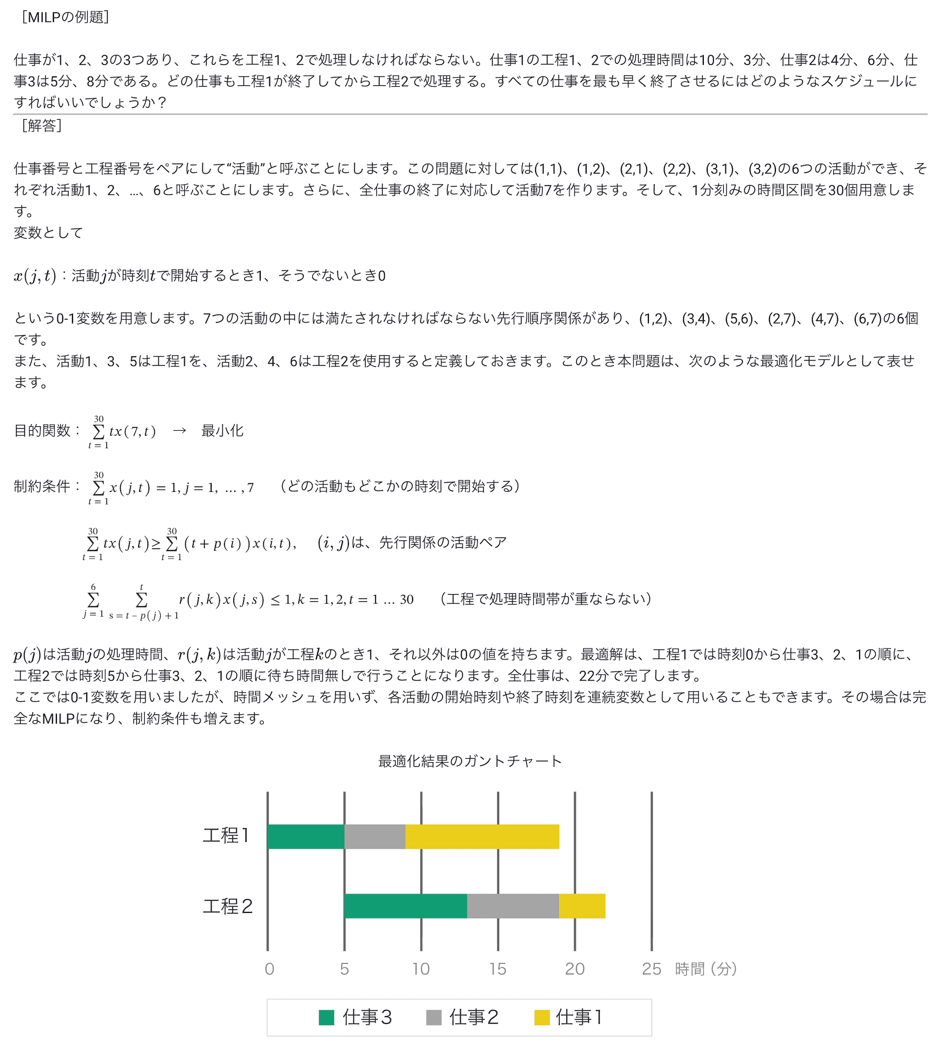 実は数理最適化問題の中で応用上多く現れるにも拘わらず、主として計算時間がかかるために解くのが難しいとされている組合せ最適化問題の多くが、MILPでモデル化できます。組合せ最適化問題では制約条件が論理的な条件で表されることが多いですが、それらは、条件の成否に対応して1と0の値をとる論理変数を導入することにより表現できます。また、スケジューリング問題等で時間の概念を扱う場合でも、開始時刻に対応する離散変数を導入したり、計画対象の時間範囲を細かい間隔に離散化するなどの方法によって、MILPとしてモデル化することができます。